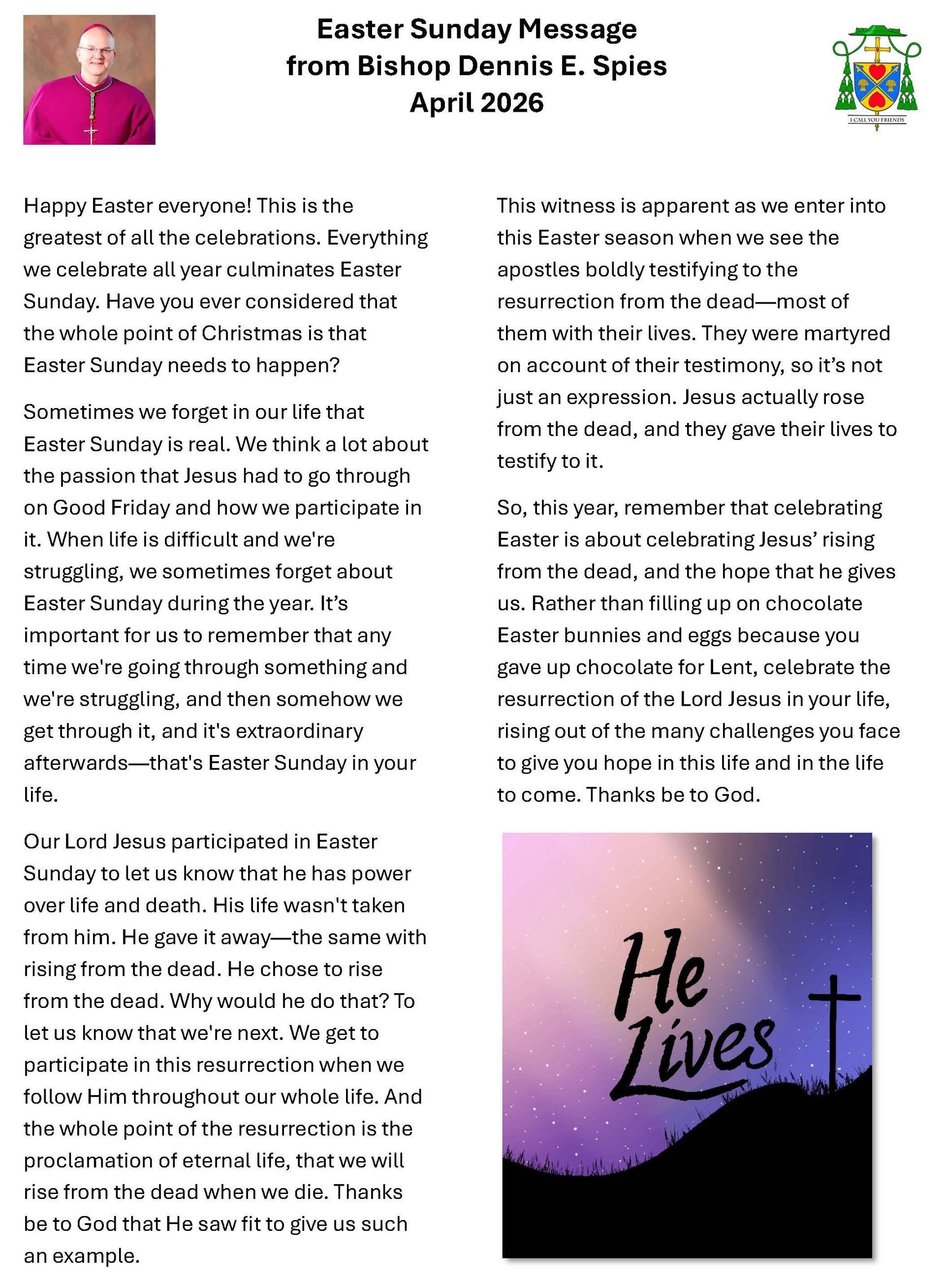 Eastertide is the fifty-day season in which Catholics celebrate the Resurrection of Jesus, from Easter Sunday through Pentecost. It highlights Christ’s transformative victory over death and invites us to deepen our joy, hope, and renewal as Easter people. Join Bishop Dennis E. Spies in celebrating Eastertide and exploring how we can carry the message of the Resurrection into the world with renewed faith and purpose.