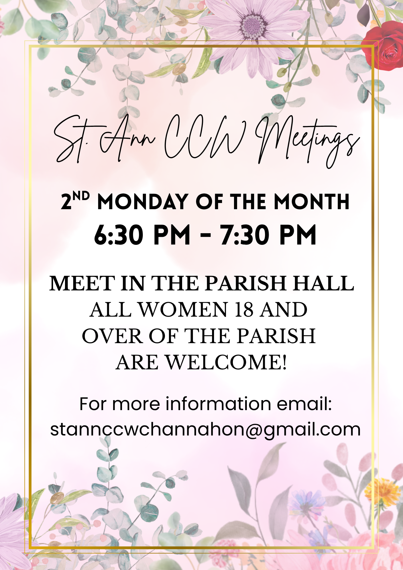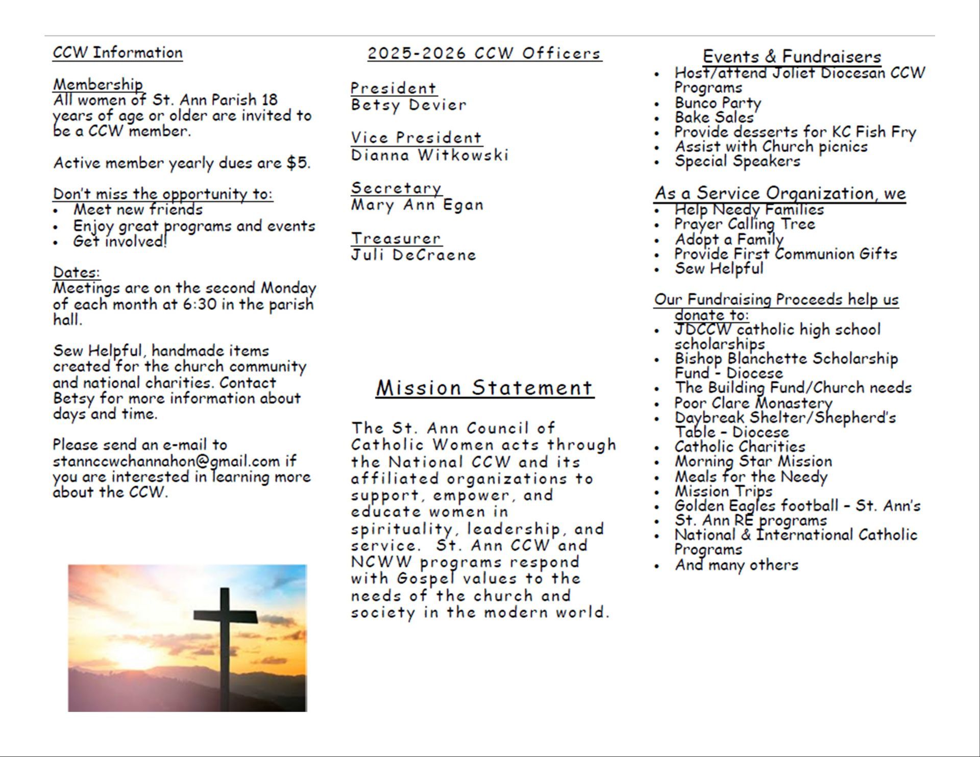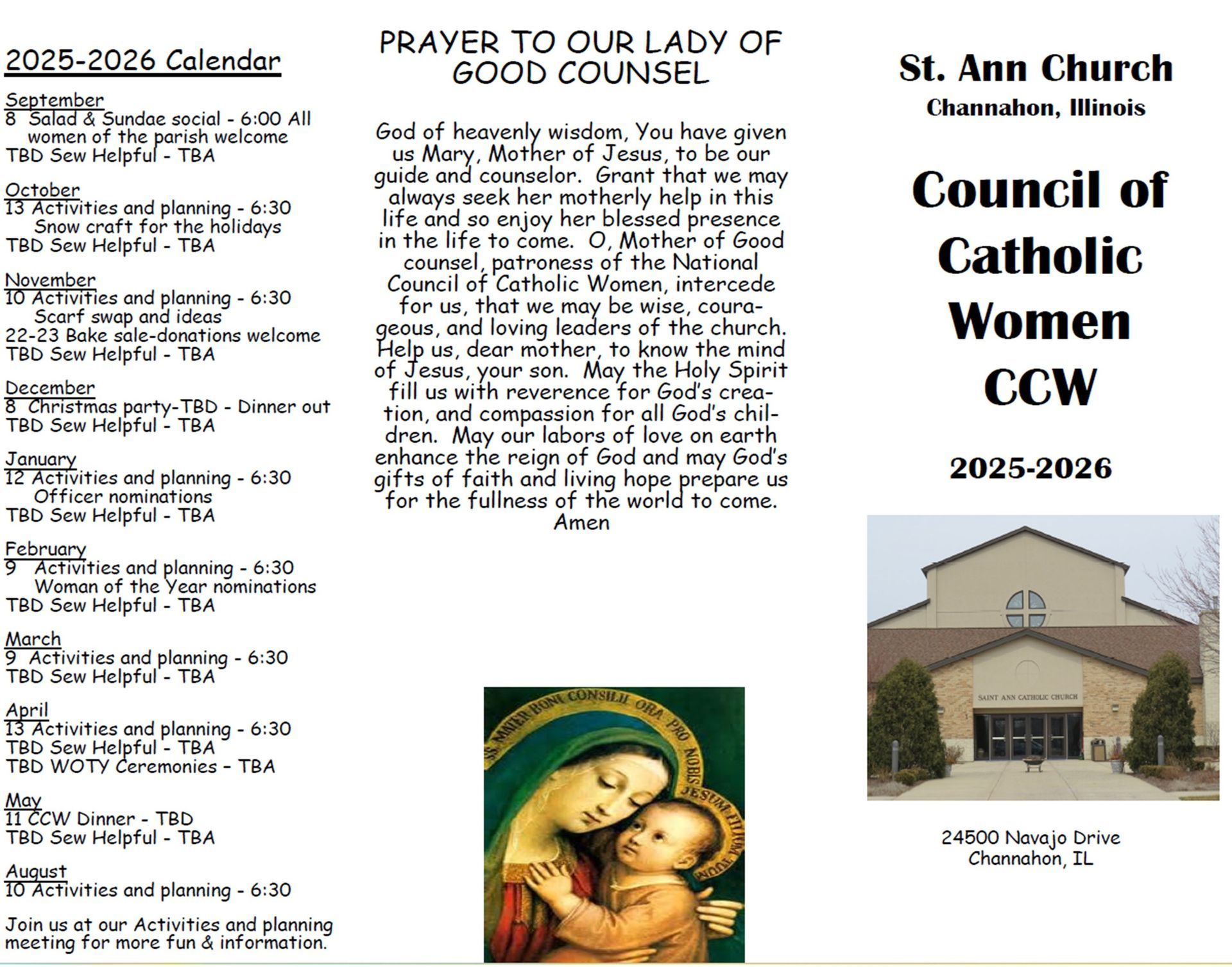 The St. Ann Council of Catholic Women acts through the National CCW and its Affiliated organizations to support, empower, and educate women in spirituality, leadership, and service. St. Ann CCW and NCCW programs respond with Gospel values to the needs of the church and society in the modern world.