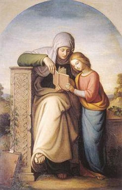 St. Anne is often depicted as a seated woman with a book upon her lap and the child Mary leaning against her, eager to learn. This image tells us what we know of St. Anne, as well as the reason St. Anne is honored to this day. St. Anne had a unique position in which God entrusted to her the task of bringing up Our Lad in a holy and virtuous way. While teaching Mary to cook, take care of her home, and look after her family and neighbors, St. Anne modeled for the Virgin Mary a life of prayer, love, and humility. Ind doing so, St. Anne prepared Our Lady to receive Our Lord not only into her heart, but into her very body, becoming the Mother of God.